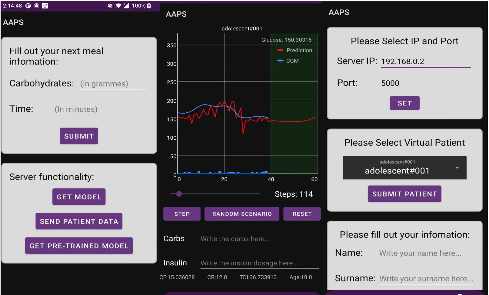 The glucose prediction model achieved an RMSE of 10mg/dl±3 which based on the research conducted is very good result,and considering that the model was trained on a small dataset of 23 virtual patients and that I had to keep the model as small as small as possible so it could run on Android devices The insulin calculation model was able to keep virtual patients in the optimal range for more than 70% which is the recomended TIR based on the consensus in the field.