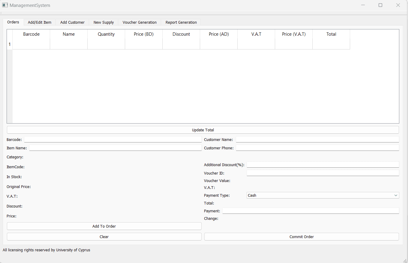 The system can be used to create new products, save customers, add suppliers, add suppliers, create orders, create invoices, create receipts and create reports. This system can also create vouchers for customers to use. The vouchers are split in to 2 different types. The first type is a voucher that gives a discount to the customer and the second type is refund voucher. If a customer decided to return a product the system can create a refund voucher for the customer to use. Then the customer can exchange it for any other product in the store matching the value of the voucher. Alternatively, the customer can pay the difference, these can all be handled by the system. The system can export all the data in a pdf format like it that was requested by the customer or print it directly on paper.
