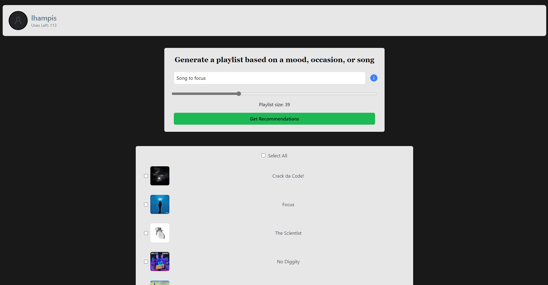 Users can generate song suggestions by describing a mood or theme. This web application operates on a freemium model; users can buy additional playlist creations using Stripe. Backend operations are supported by Realm with a MongoDB database. Hosted seamlessly on Vercel, it bridges natural language capabilities and music, offering a personalized listening experience.